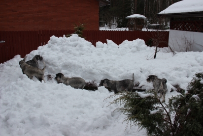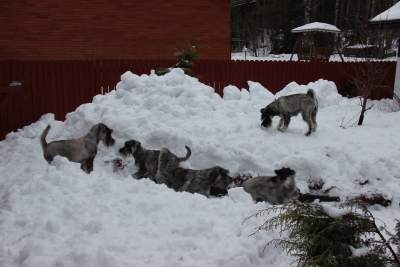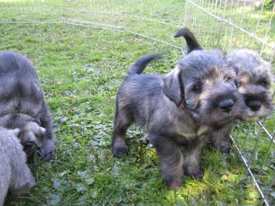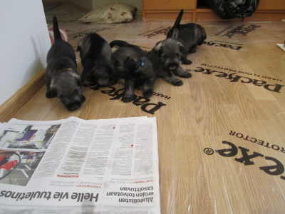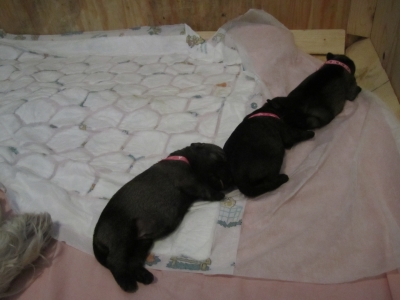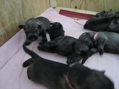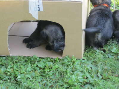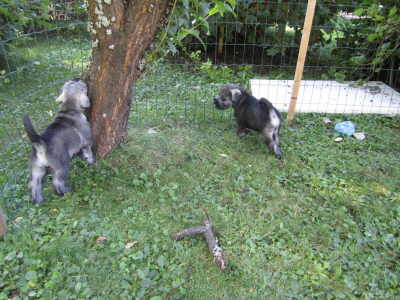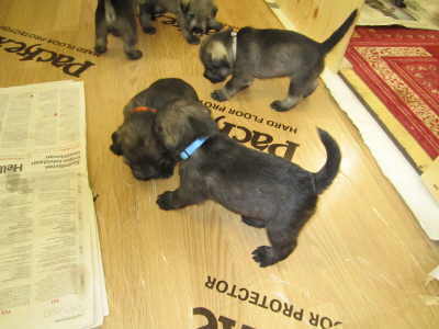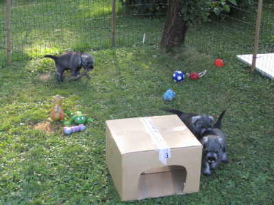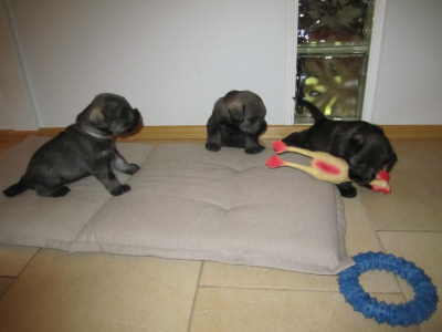 | Kaksi poikaa touhuaa | 7-viikon ikäiset pennut kaikki samassa kuvassa | |||